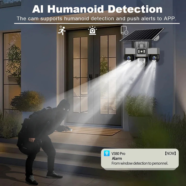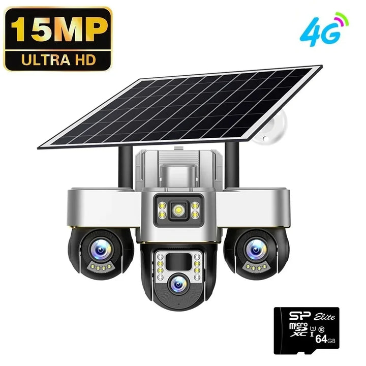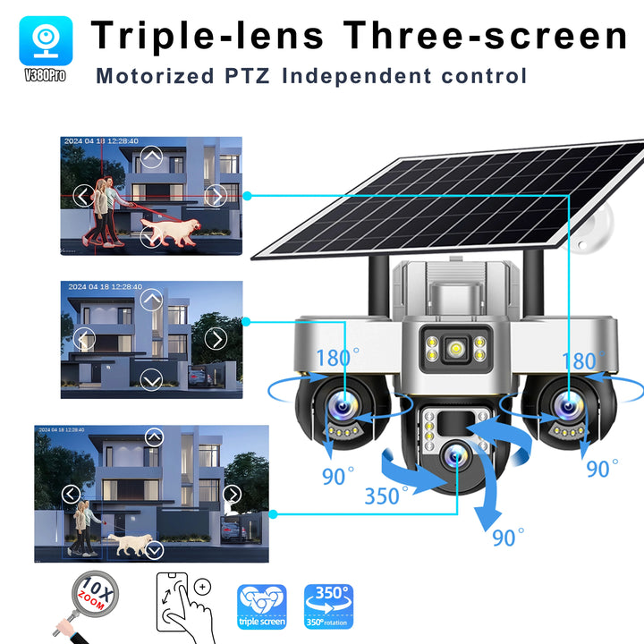 Cameră de supraveghere solară 4G,cartela sim cu 3 lentile și mișcare PTZ – rezoluție 15MP, autonomie extinsă, control prin aplicație V380 Pro