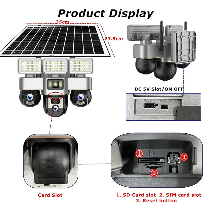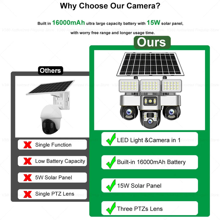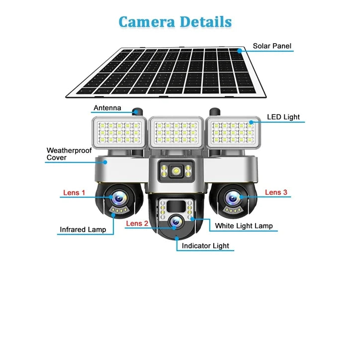 Cameră de supraveghere solară 4G cu 3 lentile și mișcare PTZ – rezoluție 15MP, autonomie extinsă, control prin aplicație V380 Pro