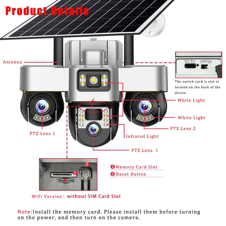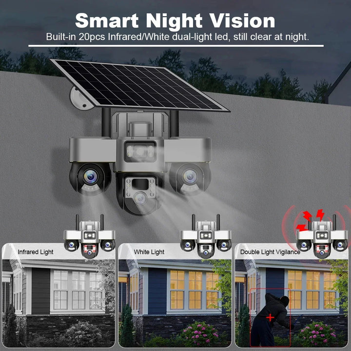 Cameră de supraveghere solară WIFI cu 3 lentile și mișcare PTZ – rezoluție 15MP, autonomie extinsă, control prin aplicație V380 Pro