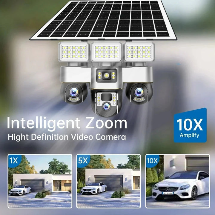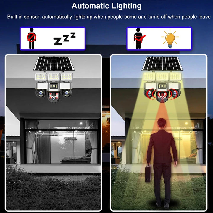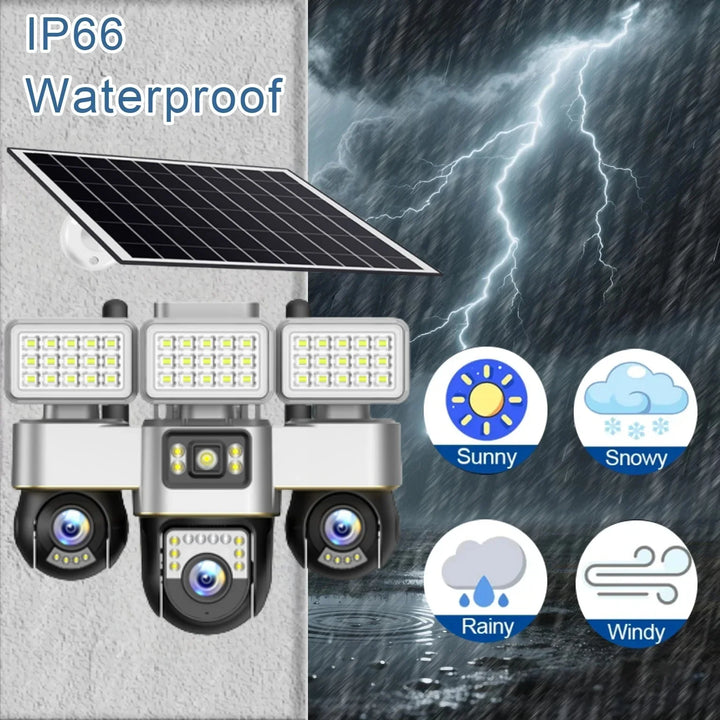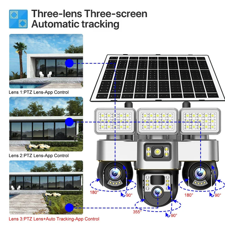 Cameră de supraveghere solară WIFI cu 3 lentile și mișcare PTZ – rezoluție 15MP, autonomie extinsă, control prin aplicație V380 Pro
