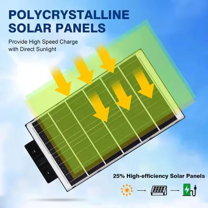 - Panou solar: Panou solar policristalin de înaltă eficiență, care încarcă bateria pe timpul zilei și asigură o funcționare continuă pe timpul nopții.