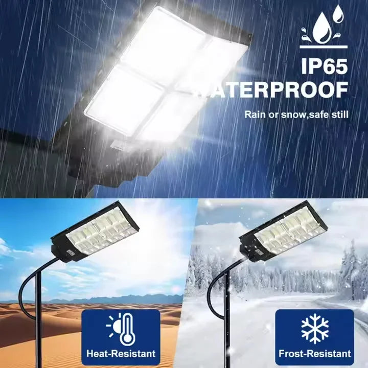 Lampa Solară Stradală Tripla 1152 LED 1500W este soluția ideală pentru iluminarea exterioară eficientă și ecologică, oferind lumină puternică și siguranță sporită în diverse spații.
